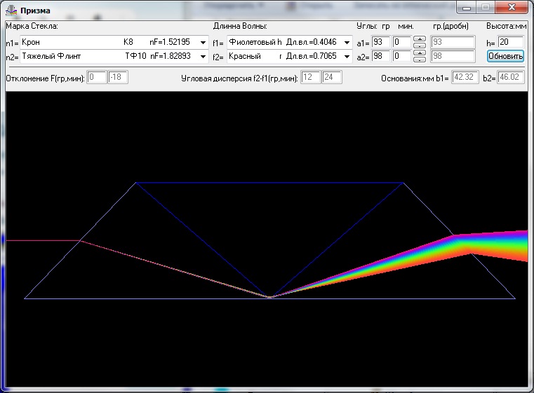 Программа призма для подбора параметров системы из трех призм, первая и третья одинаковы, вторая из более плотного стекла. Цель подобрать материал и параметры призм для получения наибольшего расхождения углов преломления белого света.