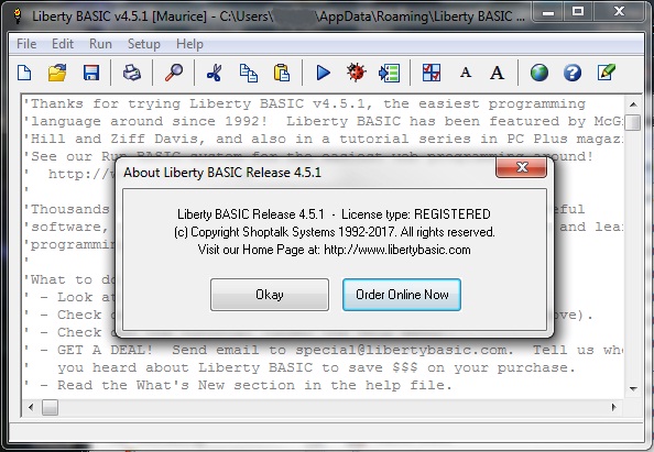 Пакет установки содержит предкомпилятор, интерпретатор языка Liberty Basic v. 4.5.1, англоязычную справку и уроки, а также примеры программ.
